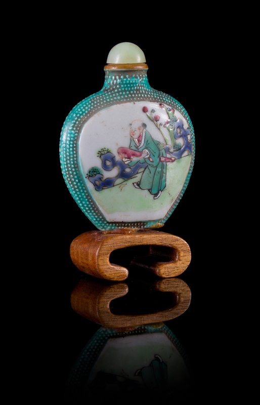 of flattened shield-form, having two raised panels one painted to show a boy figure carrying the musical instrument qin in an outdoor setting, the other a calligraphic inscription, all set above a stippled turquoise ground, the underside bearing a three-character iron red mark, raised on a hardwood stand, having a hardstone stopper.