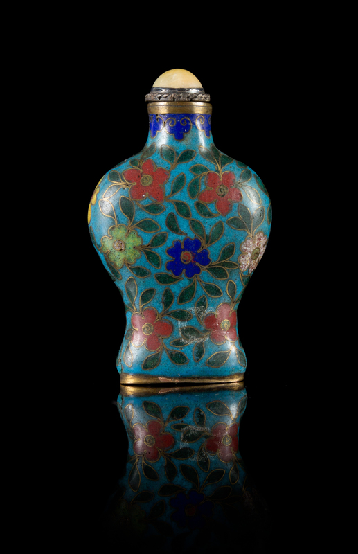 of flattened form with a recessed waist, decorated overall with flower heads and leafy branches against a blue ground.