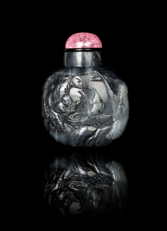 of circular form, carved to depict an old man and a boy fishing in a rocky landscape.