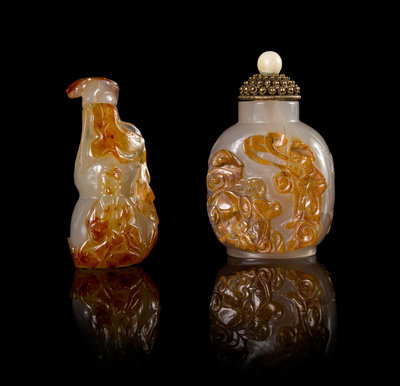the first of flattened form, each face carved to depict to figures in a landscape, the shoulders carved with birds, the second of gourd-form, carved to depict a seated man among twisting vines and leaves.