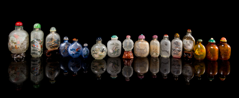 comprising ten examples of clear glass, three examples of amber glass, three examples of blue glass, and one example with Peking glass overlay, depicting various scenes.