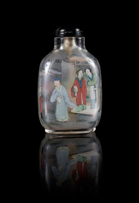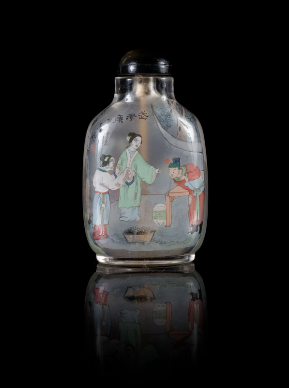 of rounded rectangular form raised on a short oval foot, painted on both sides with two scenes from the Chinese classic Liaozhai zhiyi (The Strange Talk of Liaozhai), signed Ye Zhongsan with one artist's seal, dated jiazi zhongxia (mid-summer in year 1924), having a black hardstone stopper.