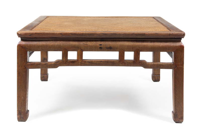 the square top inset with a woven surface, above pierce carved aprons, raised on four square legs.