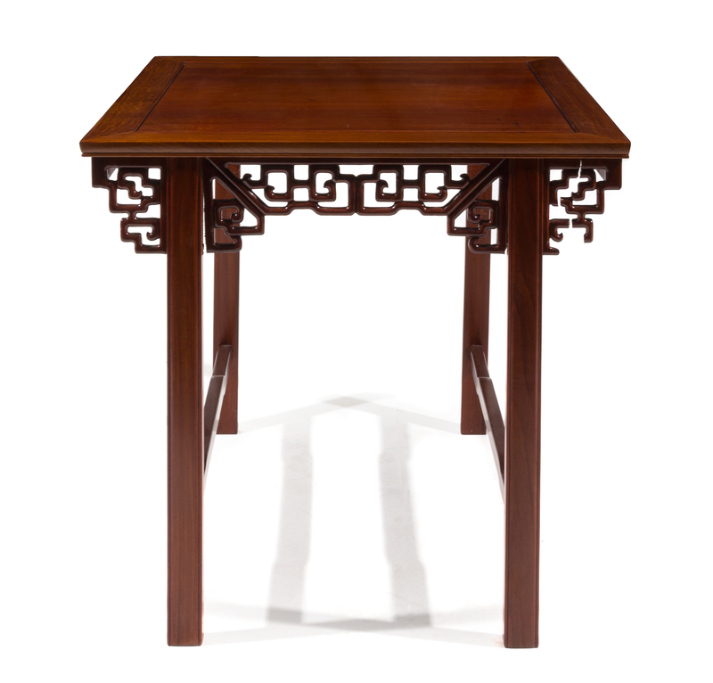 having a square top above a reticulated aprons decorated with foliate scrolls, raised on square sectioned legs.