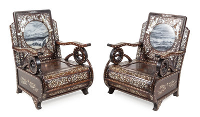 A Pair of Chinese Export Marble Inset Mother-of-Pearl Inlaid Rosewood Armchairs