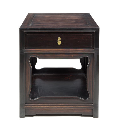 the square top over a single pull drawer, raised on four shaped legs joined by shaped stretchers.