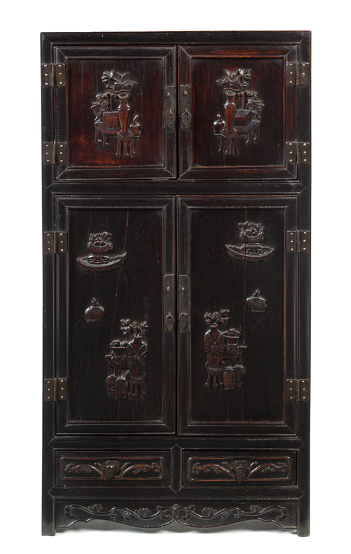of rectangular form, the top drawer with two pull-out doors above a pair of doors opening to a large shelf, the panels carved in relief with bogu motifs.