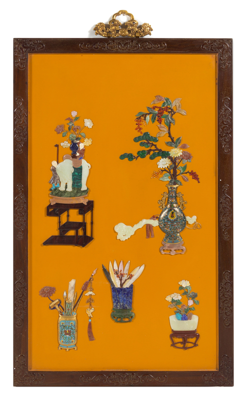 of rectangular form embellished with cloisonne enamel, jade, agate, lapis lazuli, malachite and other hardstone depicting flowered-filled vases, vessels containing previous objects, a ruyi scepter and a model of caparisoned elephant above a side table, set within a hardwood frame carved with chilong decoration.