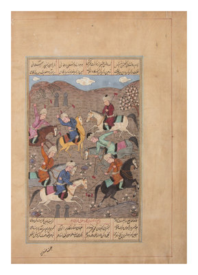painted to depict various equestrian figures playing polo, with inscriptions in black ink continues to the reverse.