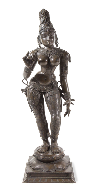 depicted standing in tribahanga on a double lotus plinth, the right hand in tarjanimudra, the left extended down towards the ground, wearing a dhoti, her bare chest and arms adorned with necklaces and armbands, the face with almond shaped eyes and a gentle smile flanked by elongated earlobes, surmounted by an elaborate headdress.