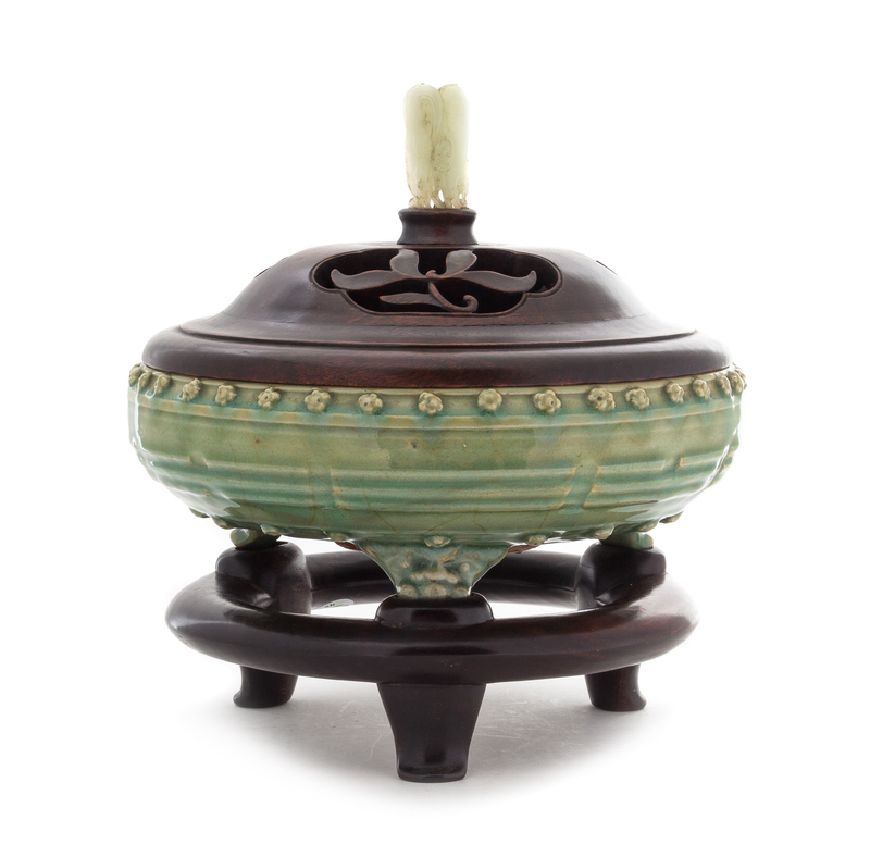 of compressed circular form body molded with a band of eight trigrams bagua between two circles of small flower heads, raised on three paw feet, together with a reticulated hardwood stand and a hardwood base.