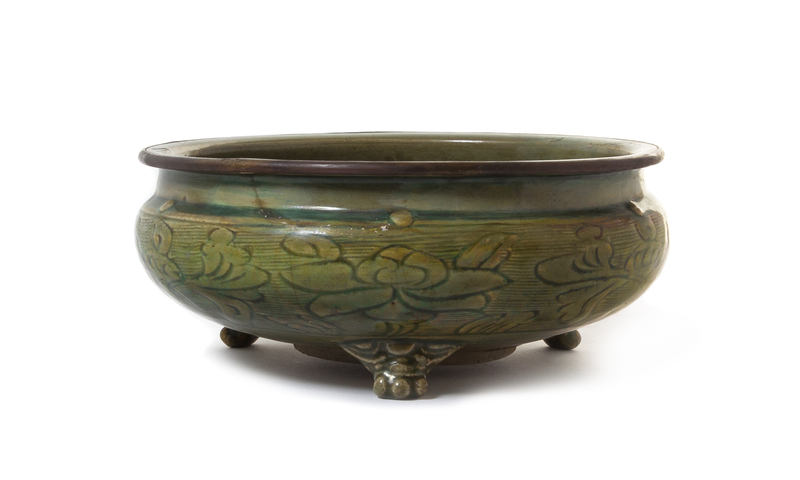 the compressed globular body with incised floral decoration, raised on three paw feet, surmounted by a lipped mouth.