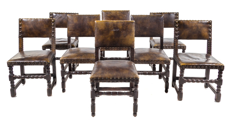 each having a tooled leather upholstered back and seat, raised on turned legs joined by stretchers.