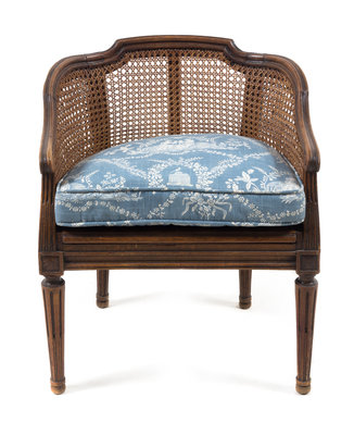 having a shaped channel molded crest rail above the caned back and seat with a cushion, raised on fluted cylindrical tapering legs.