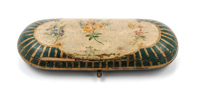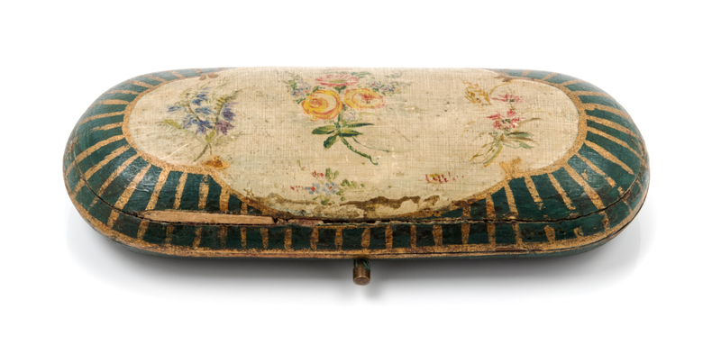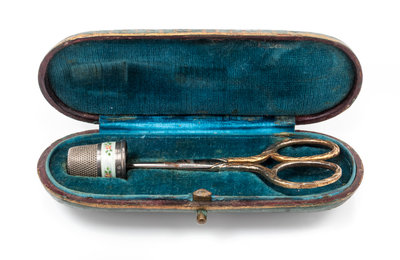 the knurled body above a white guilloche enamel band with polychrome floral sprays, together with an associated pair of scissors and a fitted case.