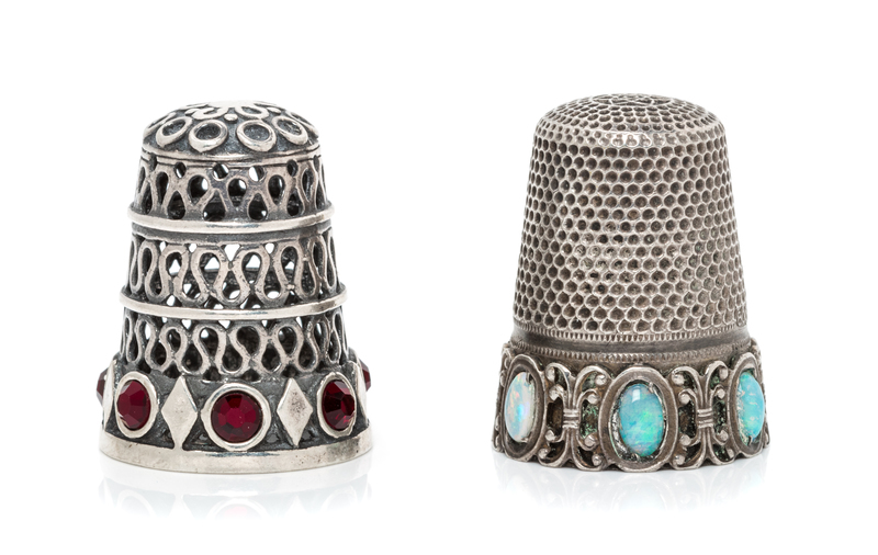comprising an example with three tiers of pierced wrigglework above a band of lozenge form plaques spaced with inset hardstone cabochons, together with an example having a dimpled top and body above a band with inset white opal cabochons.