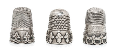 each having a knurled top and body above a band worked to show fleurs-de-lis.