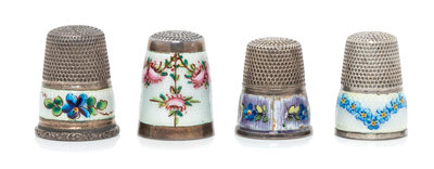 each having a knurled top above an enamel decorated body with polychrome floral sprays.