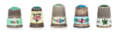 A Collection of Five Continental Silver and Enamel Thimbles