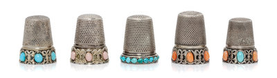 A Group of Five Continental Silver and Stone Thimbles