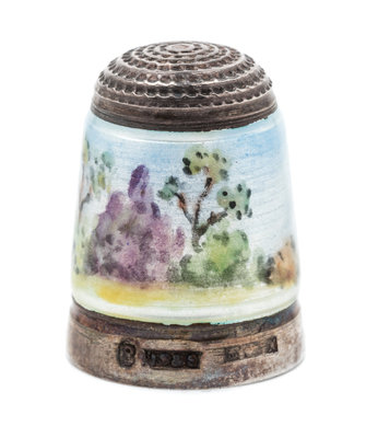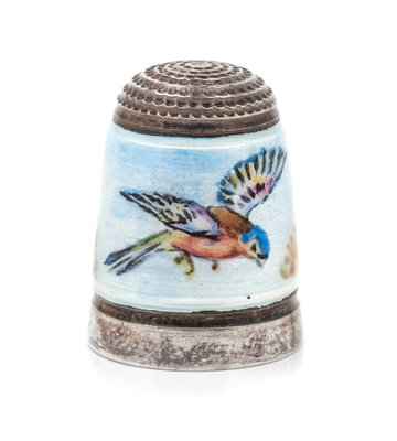 the knurled top above a polychrome enamel band depicting a bird in a forest setting.