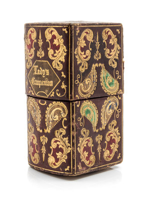 the tooled leather case with gilt and polychrome foliate and volute decoration opening to a fitted interior with a stiletto, bobbin, scissors, button hook and two other articles, Joseph Swan & Sons, Birmingham, 1869.