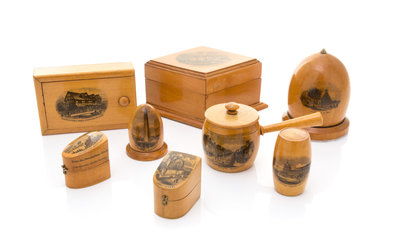 Eight Mauchline Ware Sewing Caddies and Thimble Cases