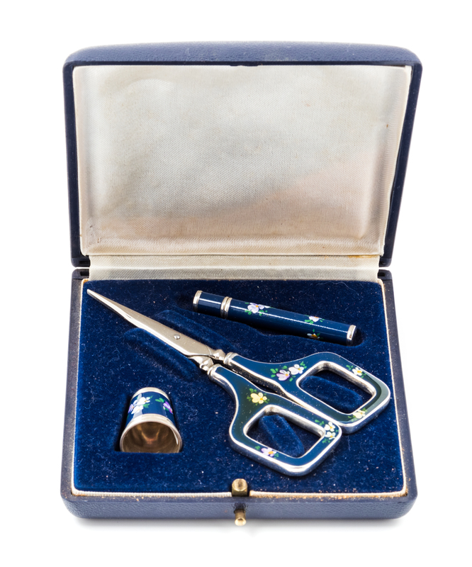 comprising scissors, a thimble and a needle case, each having a dark blue enamel ground with polychrome floral decoration in a fitted case.