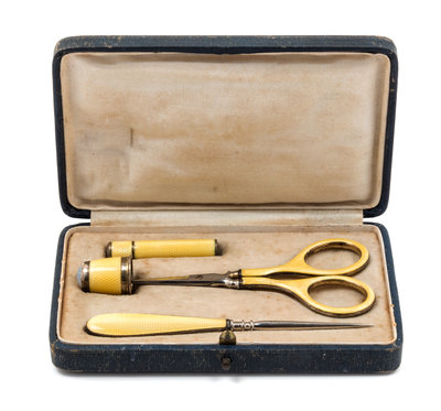 A German Silver and Guilloche Enamel Four-Piece Sewing Kit