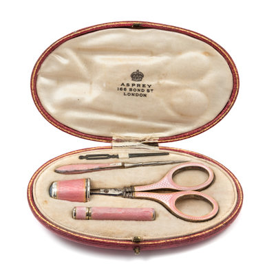 comprising scissors, a thimble, a stilletto, a needle case and a bodkin in a fitted case, all items except the bodkin with pink guilloche enamel decoration.