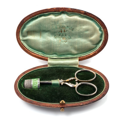 the thimble with a green guilloche enamel ground and floral and C-scroll decoration, together with an associated pair of scissors and a fitted case.