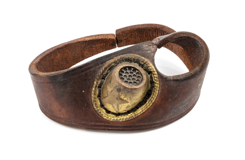 the thimble having a gilt metal finish, attached to a leather hand strap.