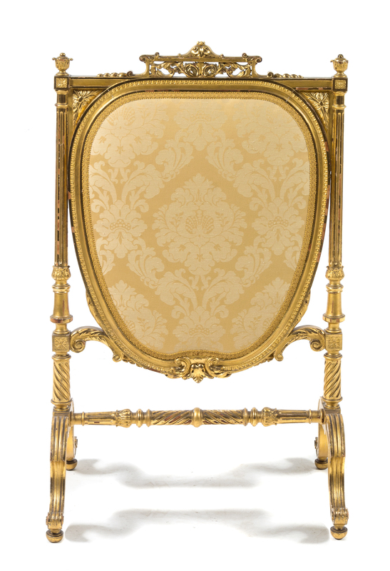 the openwork crest rail carved to show foliate scrolls above the cartouche form upholstered screen, raised on fluted twin supports joined by a fluted and twist-fluted stretcher.