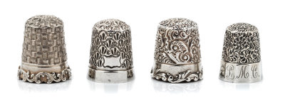 comprising an example with a top and body worked to show a simulated basket weave pattern above a rim worked to show C-scrolls and foliate volutes; an example with an Embroidery decorated top and body above a plain rim; together with an example with a volute decorated top and body, Ketcham & McDougall, Brooklyn, NY and an example with a plain, paneled base, Simons Bros., Philadelphia, PA.