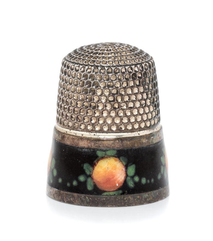having a knurled top and body above a black enamel band decorated to show fruit and foliate decoration, size 8.