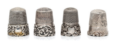 comprising an example having a knurled top and body above a plain band engraved Mother's, Ketcham & McDougall, New York, NY; an example having a knurled top and body above an openwork band bearing a vacant cartouche, Simons Bros, Philadelphia, PA; an example with a band having applied volute decoration, Ketcham & McDougall, Brooklyn, NY; together with a French example with a knurled top and body above an openwork border worked to show foliate swags.