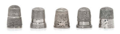 comprising an example having a Greek meander decorated rim, Webster Co., North Attleboro, MA; an example having a coffered double band at the base, Bass Mfg.; an example having a spot-hammered band bearing an engraved monogram, Simons Bros., Philadelphia, PA; together with two other unmarked examples with geometric decoration.
