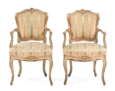 each having a foliate carved crest rail above the padded back and stuffover seat within open arms, raised on floral and foliate carved cabriole legs.