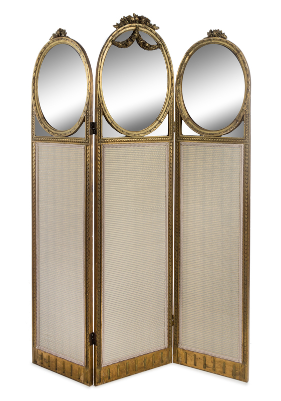 A Louis XVI Style Giltwood Three-Panel Floor Screen