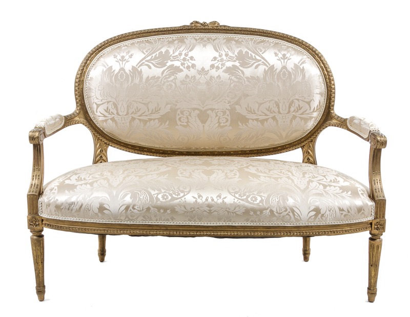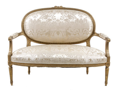 having a curved ribbon tied crest rail with running coin decoration above the padded back, arms and stuffover seat, raised on fluted cylindrical tapering legs.