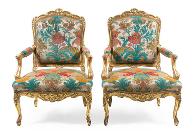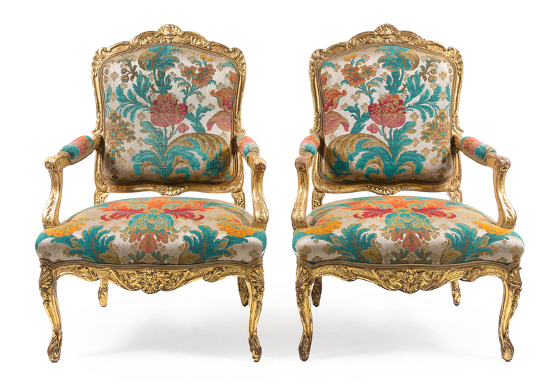 each having a shaped crest rail carved to show C-scrolls, rocaille and foliate decoration above the padded back, arms and stuffover seat, raised on similarly carved cabriole legs.