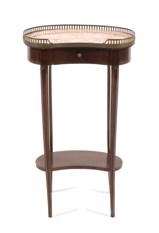 the three-quarter galleried top above the conforming case fitted with a single drawer, raised on faceted tapering legs joined by a reniform medial shelf.