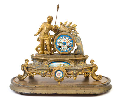the case cast to show a soldier holding a spear before a military trophy, his breastplate bearing a cross, the circular painted porcelain dial with Roman numeral hours, signed S. C. Newhall/ Lynn, raised on a shaped base inset with two porcelain plaques depicting a landscape and a floral spray and ending in scroll feet, further set on molded oval wood plinth and encased within a glass dome.