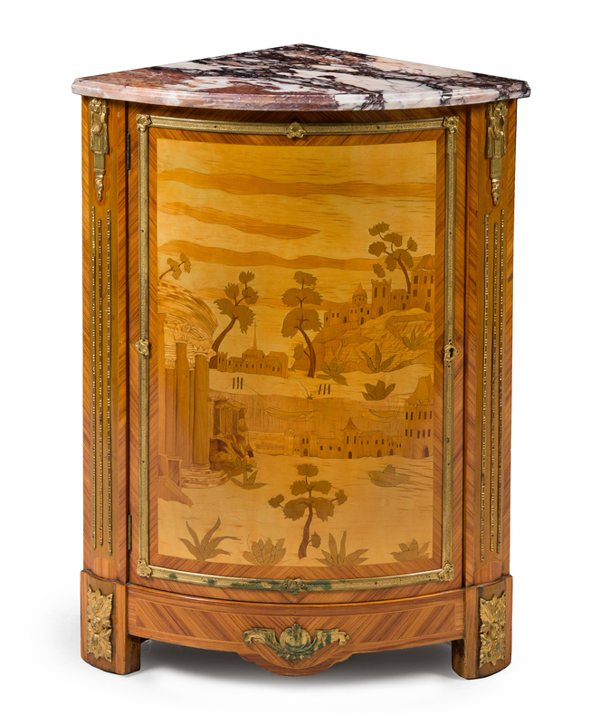 A Louis XVI Style Gilt Bronze Mounted Marquetry Encoignure