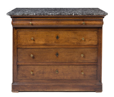 having a rectangular marble top with rounded fore-corners above four drawers.