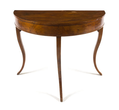 having a demilune top above the plain frieze, raised on three square tapering legs.