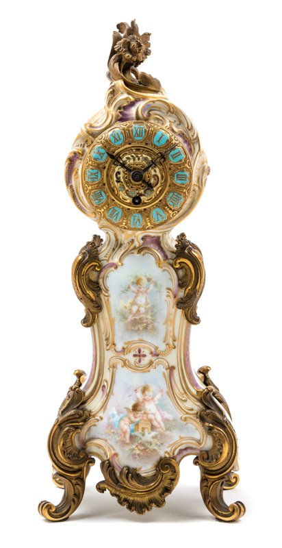 the foliate cast finial above the segmented gilt bronze and enameled dial with Roman numeral hours, the shaped case decorated with reserves formed of C-scrolls enclosing Cupid, cherubs and floral sprays, raised on scroll feet, having an A.D. Mouglin time only movement.