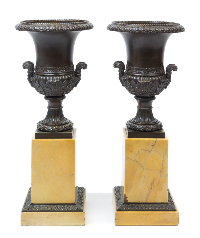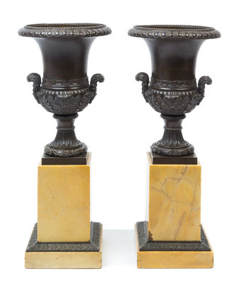 A Pair of Neoclassical Patinated Bronze Urns