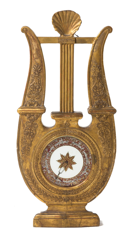 the lyrifom body having a shell finial above the likely later dial with Roman numeral hours, raised on a molded base.