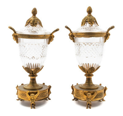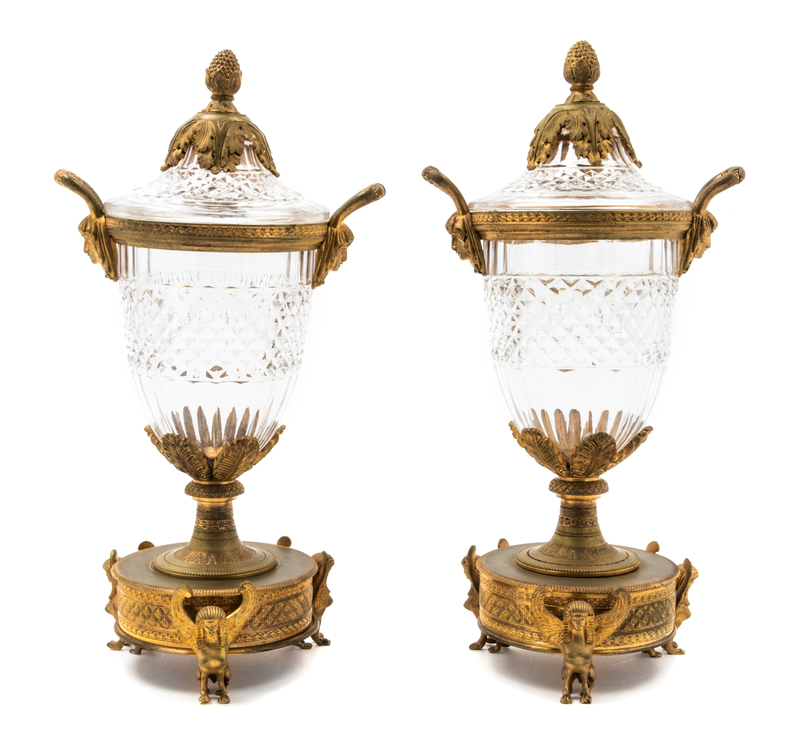 A Pair of Empire Style Gilt Bronze Mounted Cut Glass Urns